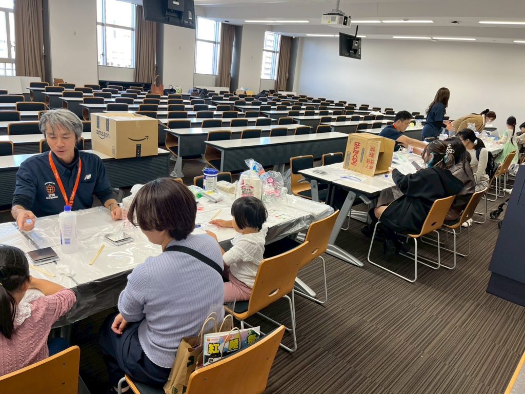 スライムづくりとともに、作ったスライムに電気を通してLED(発光ダイオード)を光らせたり、蓄光パウダーを混ぜて、暗闇で光るスライムを作る実験もしました。子どもたちはもちろん、大学生や大人からも「懐かしい!」「家でも作りたい!」との声があがり、楽しむ様子が見受けられました。3日間で約260名の方にご来場いただき、大盛況で終えることができました。