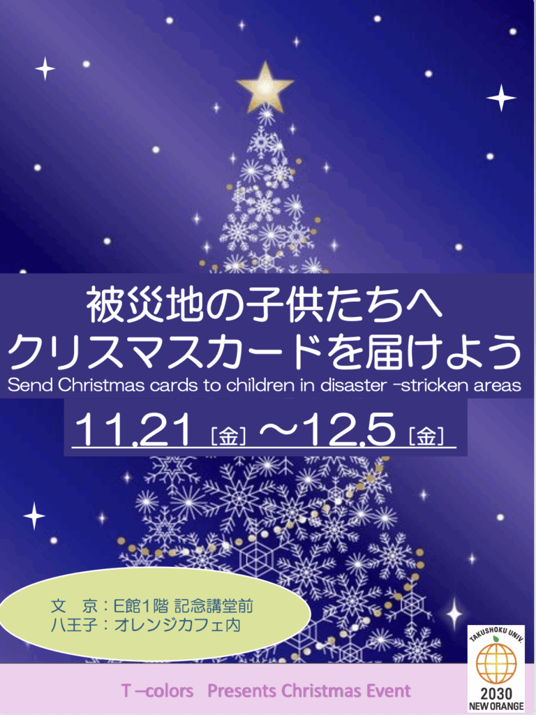 11/21(金)~12/5(金)でT-colorsによるクリスマスイベント「クリスマスメッセージカードを届けよう」を文京・八王子国際の両キャンパスで開催します。この企画は、クリスマスツリーや装飾を施したブースを設置し、そこで学生や教職員の方々から被災地の子どもたちへ届けるメッセージカードを募ります。