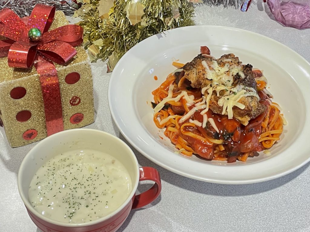 チキンの上にチーズがたっぷり乗ったボリューム満点のパスタと、クラムチャウダーがセットになった豪華なセットメニューです!