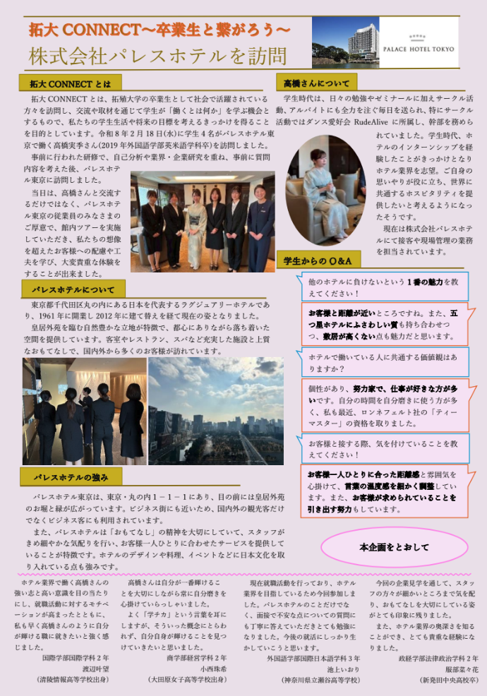 拓大CONNECT~卒業生と繋がろう~高橋 実李さん(株式会社パレスホテル)を訪問しました!