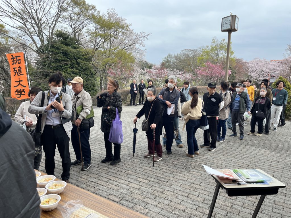 会場では新鮮な野菜の販売や、相撲部によるちゃんこ鍋の無料配布、クレープの販売などが行われ、春のキャンパスは多くの来場者で賑わいました。また、キャンパスツアーも実施され、訪れた方々に大学の魅力を伝える機会となりました。途中、11時頃から雨が降り出しましたが、来場者の安全に配慮しながら、最後まで円滑な運営補助に努めました。