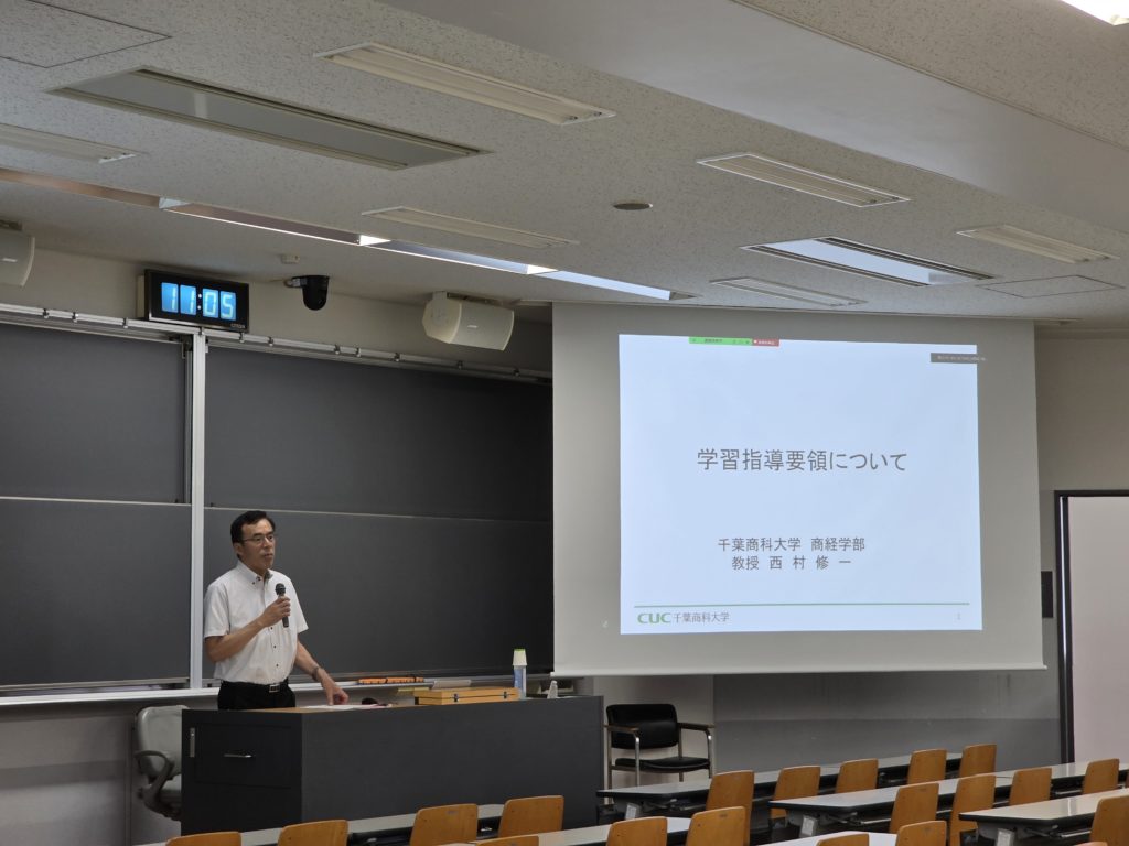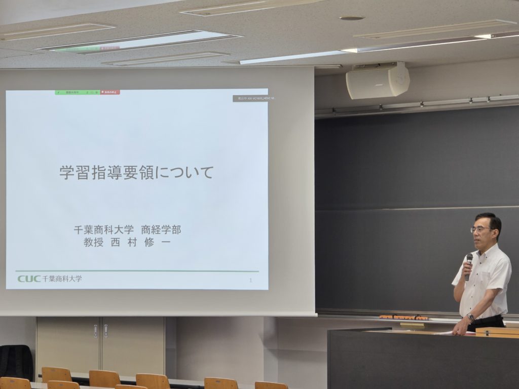 令和7年7月18日(金)に、教職課程委員会主催のFDワークショップが対面とオンラインの併用で行われました。今回のテーマは、「学習指導要領とは何か」、「現行の学習指導要領が求めていること」、「次回改訂の学習指導要領に求めること」とし、千葉商科大学教授(元文部科学省初等中等教育局教科調査官)西村修一氏をお招きしてご講演をいただきました。
