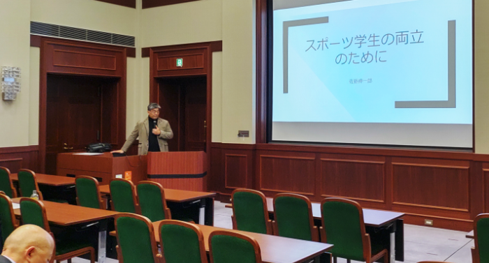 佐藤先生のお話しの後には、国際学部の西口茂樹教授と鈴木なつ未准教授が登壇し、運動部学生の状況について補足的な説明もなされました。体育振興室より川内勝弘先生にも来場いただき、運動部の概況について情報共有いただきました。