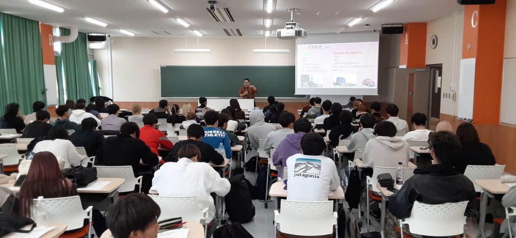 講義の冒頭では、講師による自己紹介の後、学生に漢字一文字を使ってペアで自己紹介を行い、和やかな雰囲気の中で授業が始まりました。続いて、講師自身の大学生活、メキシコ国立自治大学への留学での貴重な体験、就職活動での失敗とメキシコでの仕事の苦労について語られました。その後、そこから得た教訓や現在の仕事のやりがいについて、写真や動画をふんだんに用いながら、学生の興味を引く形で解説してくださいました。外国語学部の後輩たちへ多くの具体的なアドバイスを贈るとともに学生たちに「自分の夢」について書かせ、ペアで発表させる活動も行い、授業は時間通り終了しました。