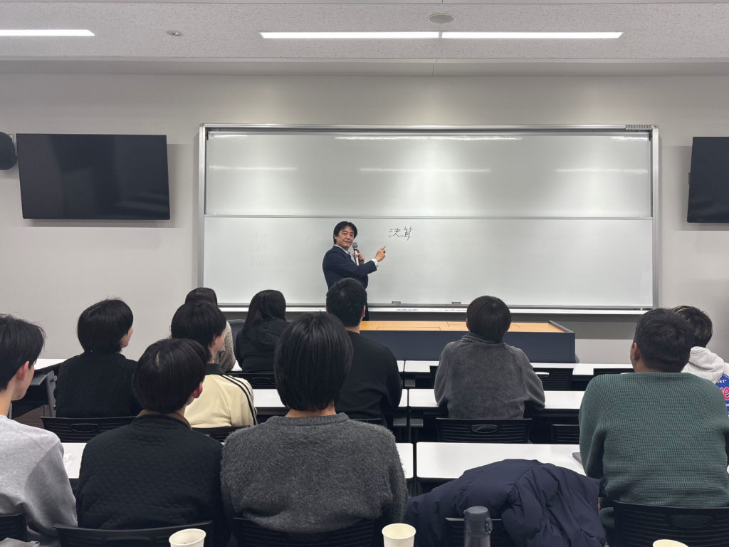 公認会計士・税理士の渡辺智信氏をお招きし、3年生と4年生のゼミ生を対象に、「原価計算・管理会計の実践的探究」というテーマで講義・質疑応答を行っていただきました。