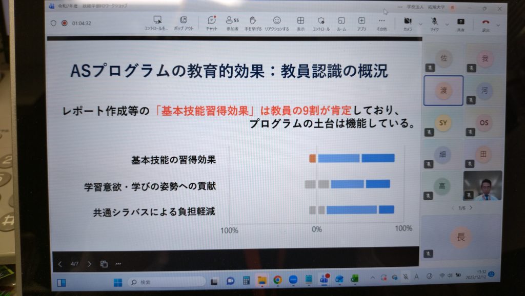 政経学部では、12月12日(金)に、Teamsによるオンライン会議で政経学部FDワークショップを開催しました。今回のテーマは「社会安全学科の新設にともなう学部内のハーモナイゼーション」でした。政経学部では、2025年4月から学部内の新学科として社会安全学科が新設されて3学科体制となりました。3つの学科の学びやハーモナイゼーションについて、教員間で情報共有するために企画されました。